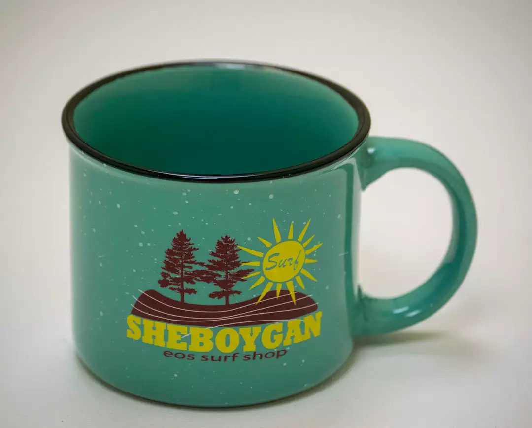 15oz ceramic mug with Surf Sheboygan logo on both sides for right and left hand drinkers.