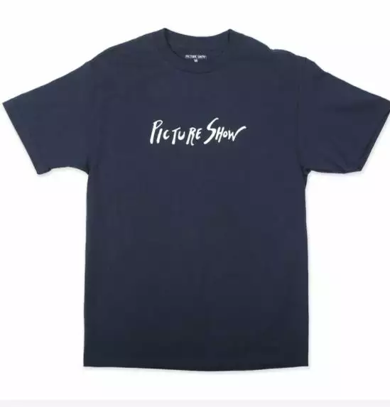 The Script Tee from Picture Show Studios features a center chest print of the hand drawn logo on a navy tee.