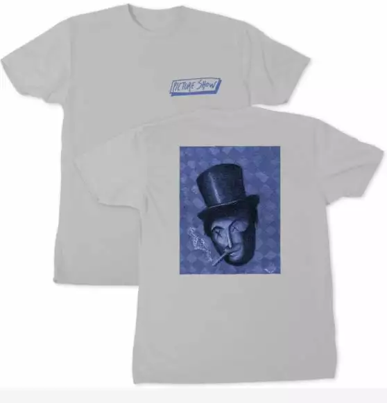 The Parlour Tee from Picture Show features a PS Script logo at the left chest and a back print of original art on a white tee.Â