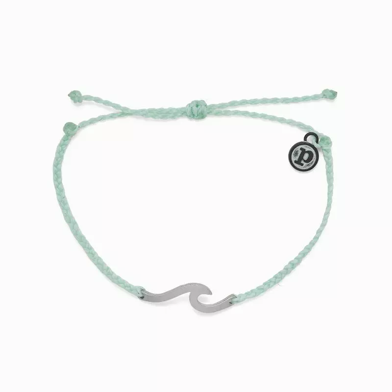 Pura Vida bitty braid bracelet with charm reading “be wild & wander” on one side, and trees etched into the other side.