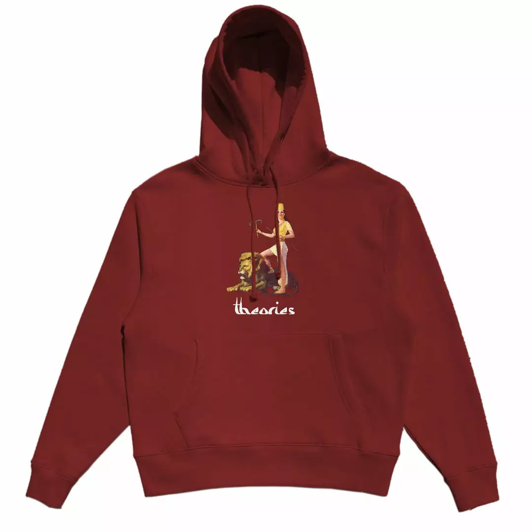 The Theories Ishtar Hoodie in Crimson. Ishtar the Goddess of Love and War shown with her tamed lion at her side.